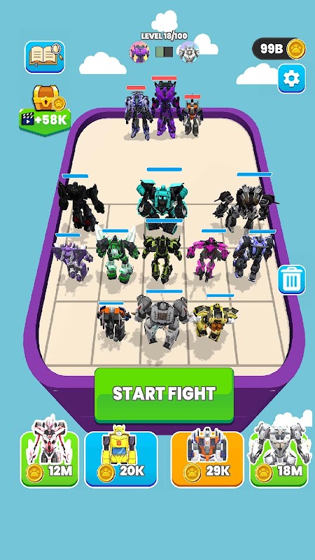 Sintetice rápidamente el robot de su automóvil en transformadores gigantes. Cuanto más alto sea el nivel del héroe transformador, más fuerte será el ataque y la defensa. Esta es la habilidad más importante en este juego, por favor dóminala. La colocación razonable de robots con diferentes atributos puede ayudarlo a ganar fácilmente. Reacciona y piensa rápido. Usa tu estrategia y tácticas para ganar la batalla y pasar al siguiente nivel.