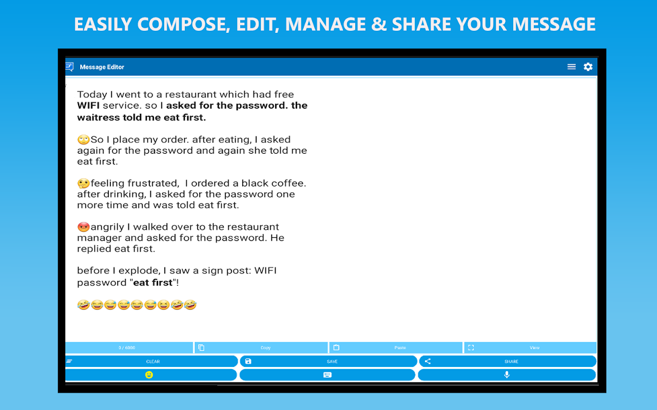Si está buscando una aplicación de edición de texto de mensajes confiable, la aplicación Message Editor Premium es su elección perfecta. Esta aplicación ofrece una interfaz de usuario sencilla e intuitiva para ayudarle a redactar, editar y compartir mensajes sin esfuerzo.
