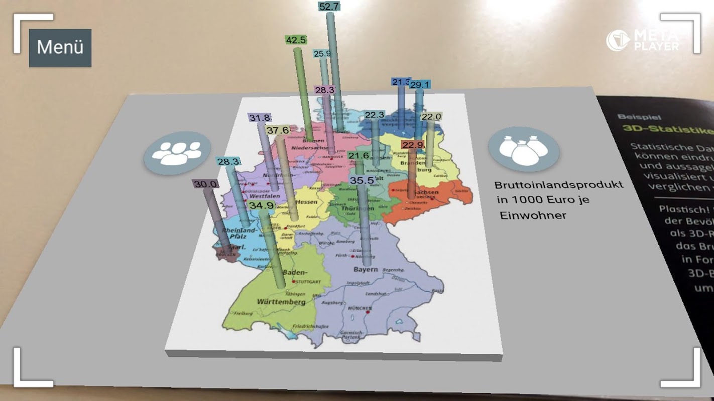 MetaPlayer hace que los objetos 3D, videos, animaciones o contenido interactivo se puedan usar en teléfonos inteligentes, tabletas o gafas de realidad aumentada. La extensión digital se muestra directamente sobre la imagen de la cámara.