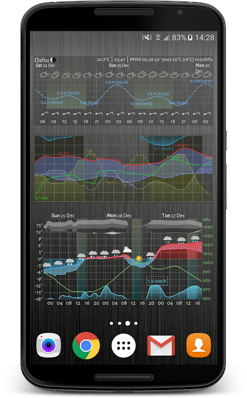 Puedes representar gráficamente parámetros meteorológicos comunes como la temperatura, la velocidad y la presión del viento, así como tablas de mareas, índice UV, altura de las olas, fase lunar, hora de salida y puesta del sol, ¡y mucho más!