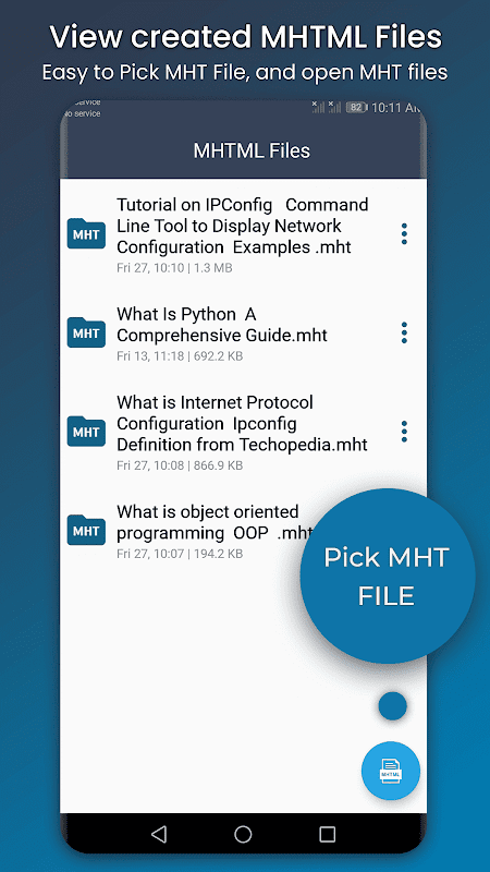 Mht Viewer y Mht creator proporcionan una manera fácil de ver el sitio web, el artículo y le dan un control total para leer el artículo o la página web en cualquier momento. Los archivos Mht o Mhtml y también llamados archivos web y el lector Mhtml leerán todos los archivos Mht que estén guardados en su dispositivo.
