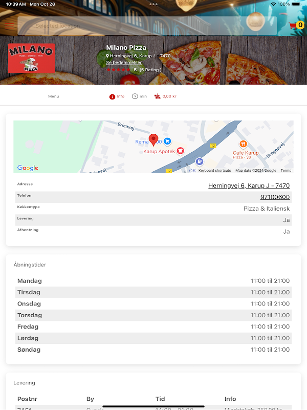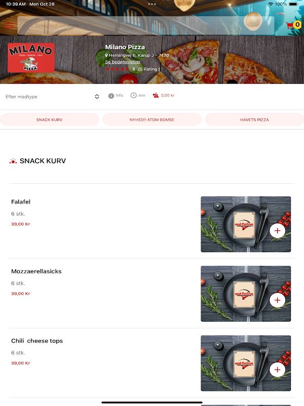 Bestil pizza, hamburguesa, pasta, m.m. med få tryk, nemt og hurtigt!