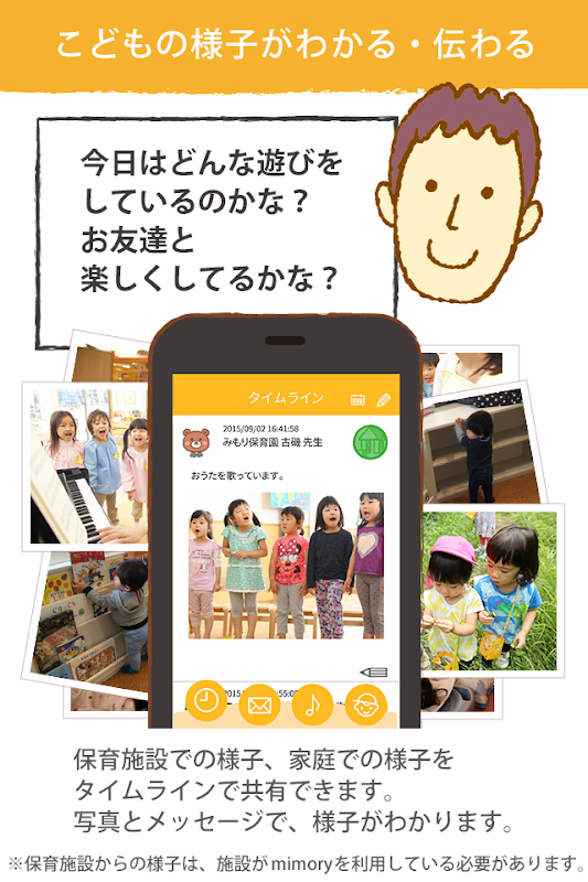mimoryでは保育園での活動や連絡をアプリで簡単に保護者にお届けすることが出来ます。家庭での活動とは違って、保育園には子どもの社会があり、普段ご家庭では見ることの出来ない表情や一面を写真を通じてお届けすることが出来ます。