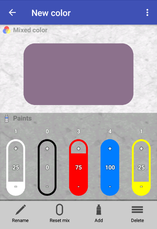Si intenta mezclar los colores en esta aplicación antes de mezclar las pinturas reales, puede encontrar fácilmente el porcentaje para mezclar para obtener el color deseado.