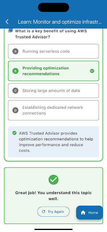 La preparación para el examen de Ingeniero Asociado en Aprendizaje Automático te ayuda a prepararte para el examen AWS Certified Machine Learning Engineer – Associate (MLA-C01). Practica en los cuatro dominios y las doce instrucciones de tareas alineadas con la guía oficial del examen, estudia con lecciones cortas, realiza cuestionarios cronometrados y ejecuta un examen simulado completo.