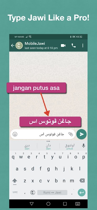 Con el teclado Rumi -> Jawi, escribe el texto con el teclado qwerty estándar que se usa para inglés y malayo. MobileJawi incluye un motor que transliterará las palabras en malayo de Rumi a Jawi mientras escribe.