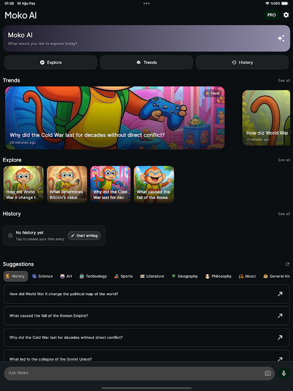 Descubre algo nuevo cada día y aprende incluso los temas más complejos paso a paso con imágenes divertidas y fáciles de entender. Moko usa tecnología de IA para hacer que cualquier tema sea divertido, sencillo y memorable, como si se lo estuvieras explicando a un mono.