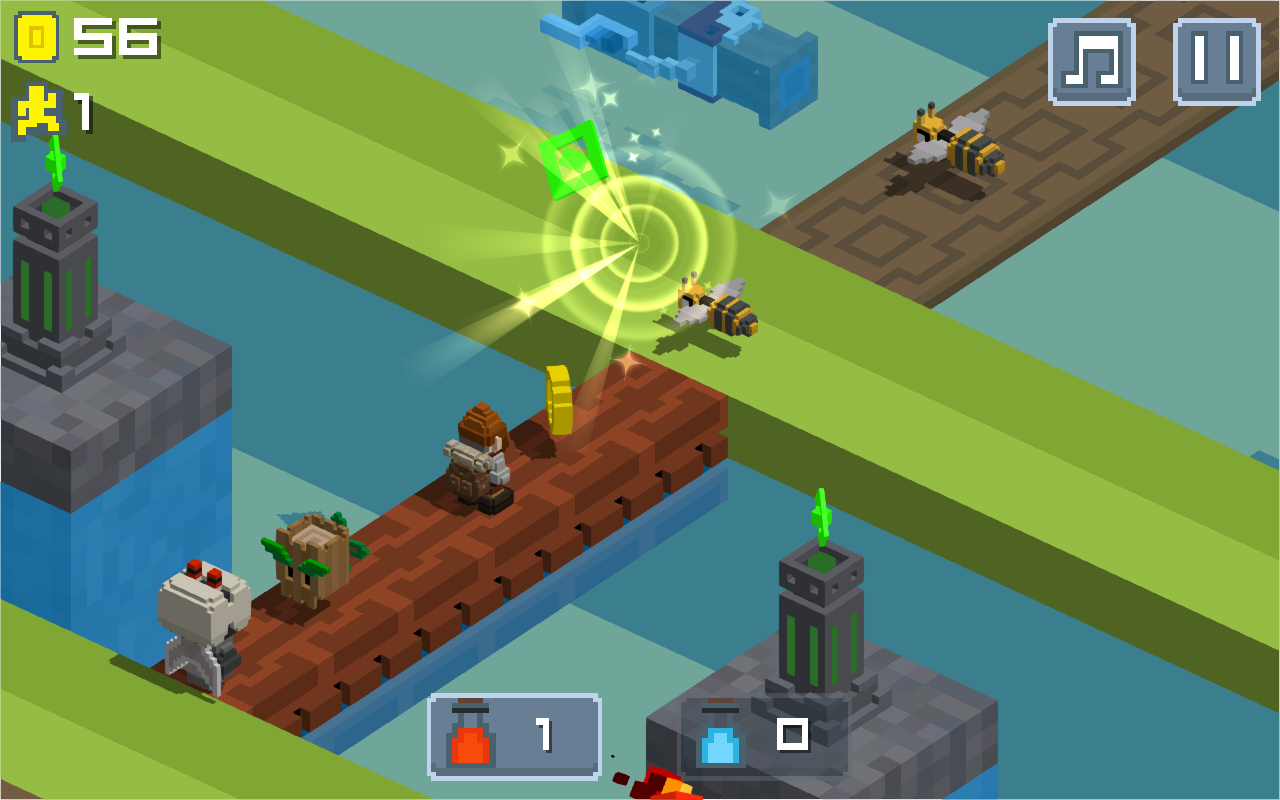 it will stop you to move forward when the monster and the fog appear in the Monster Valley,so if you use the red bottle, it will clear all the monsters in the screen, if you use the blue bottle it will clear the fog in the screen. It is pixel adventure style.