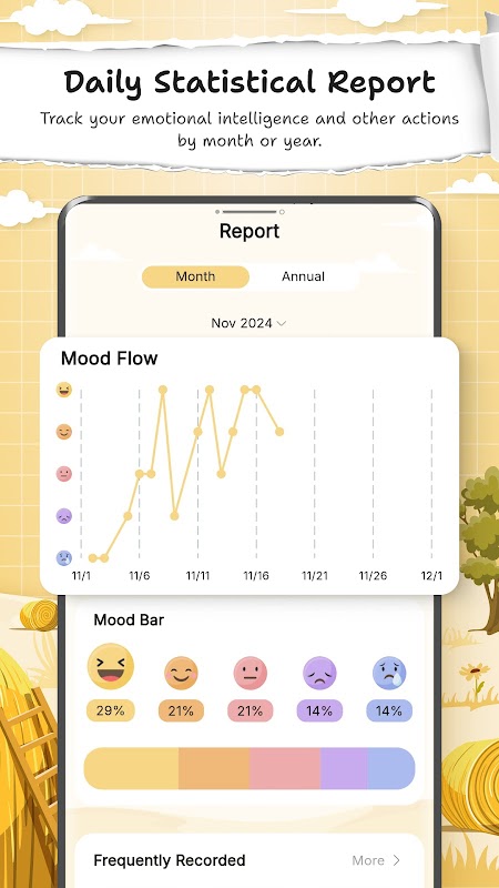 Descubra patrones en sus emociones y actividades con informes estadísticos detallados. Vea sus tendencias emocionales por día, semana o mes y realice un seguimiento de sus estados de ánimo más frecuentes. Obtenga una comprensión más profunda de sí mismo con conocimientos que respalden una mejor toma de decisiones y un crecimiento personal.