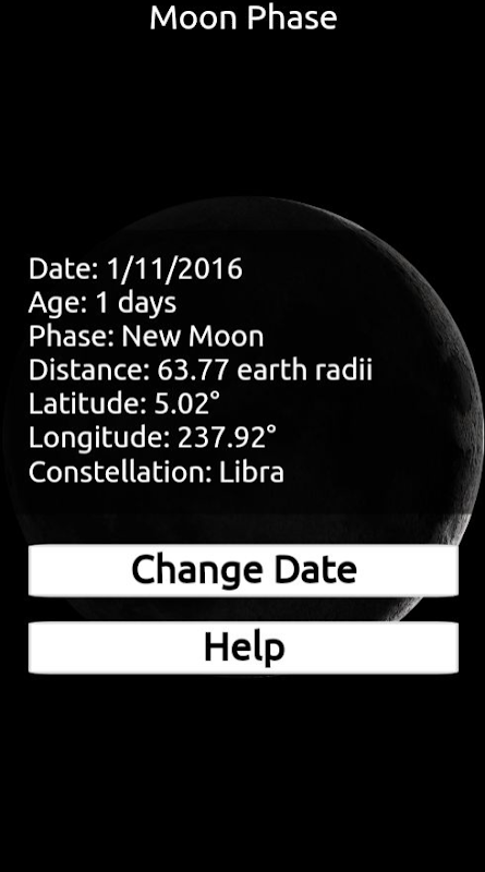 Also, app show ecliptic latitude and longitude in degrees, the moon’s distance in Earth radii, age of moon and constellation of moon.