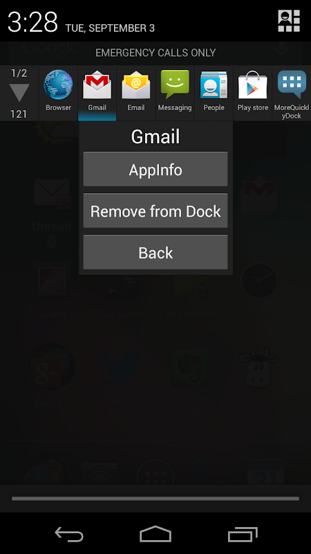 - Touch the colored bottom, and the popup menu appears. In this menu, You can Add to Dock unregistered app, and you can force to close the app from 'App Info' .