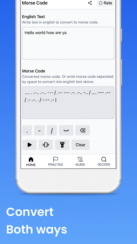 También puedes usar la traducción entre inglés y código morse y reproducir en varios formatos como sonido, vibración y luz de flash.