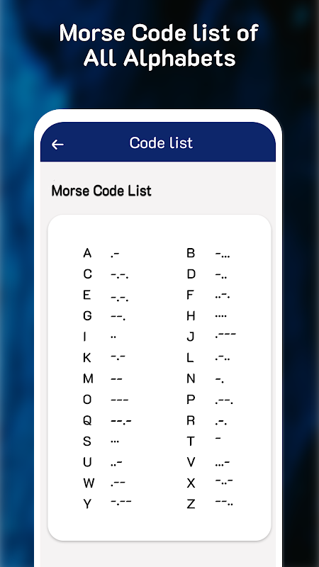 ★Lista de todos los alfabetos de código Morse: La aplicación de código Morse también proporciona una lista de código Morse de todo el texto alfabético en inglés.