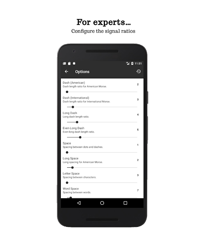 Customize your Morse code playback by set the dot-dash ratio, space, long space, word and letter space length at the advanced menu. If the default values changed the Farnsworth speed will be disabled and the value will be set to "Custom". You can reset the advanced settings anytime by changing the Farnsworth speed (using the seek bar).