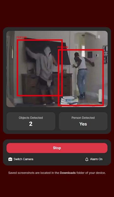 6. Guardar capturas de pantalla: la aplicación guarda automáticamente capturas de pantalla en la carpeta Descargas cuando se detecta una persona, lo que garantiza que tenga un registro de los momentos importantes.