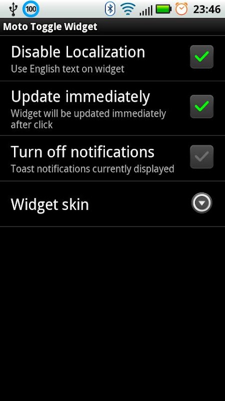Widget debería funcionar en cualquier dispositivo móvil Android 2.2 y superior, pero la piel es altamente personalizado para teléfonos MOTOBLUR (parece idéntica a otros widgets como la falta de definición del GPS / Wi-Fi / Bluetooth Toggle).