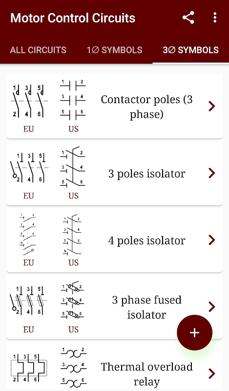 Esta aplicación está estructurado en tres pestañas separadas (Todos los circuitos, los símbolos de una sola fase, tres símbolos de fase)