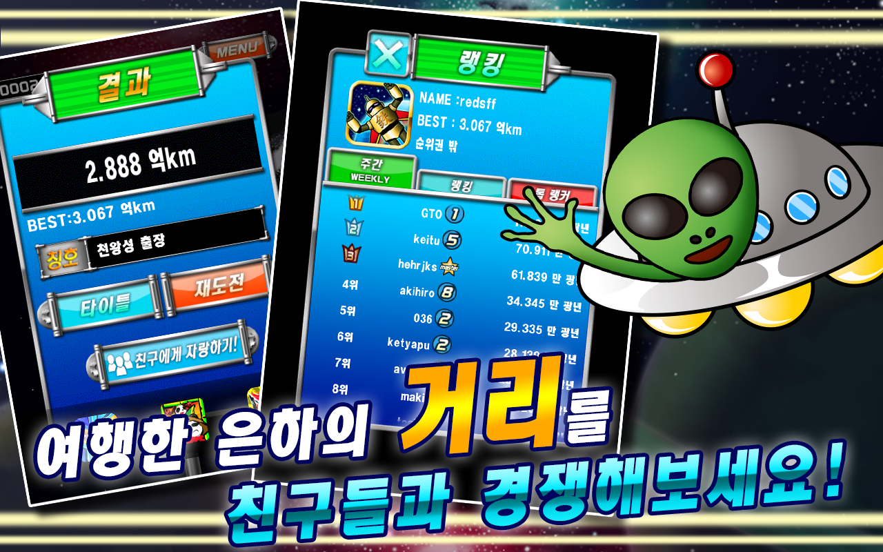 화면을 터치하여 Mr. 로켓을 좌우로 움직이며, 잇달아 나타나는 장애물을 피하면서 우주의 끝까지 날아가면 됩니다!