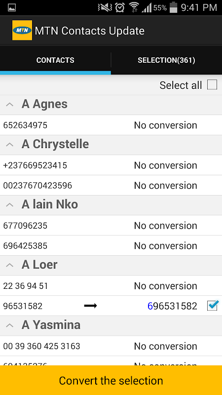 Une fois l'installation de "MTN Contacts Update" terminée, il vous suffit de lancer l'application et de suivre les instructions. L'application se charge alors de détecter automatiquement les numéros camerounais de votre répertoire qui doivent être modifiés et vous affiche en temps réel le préfixe qui sera ajouté pour chaque numéro. Vous avez alors le choix d'ignorer certains numéros et il ne vous reste plus qu'a appuyer sur le bouton "Convertir la sélection", votre répertoire est maintenant converti !