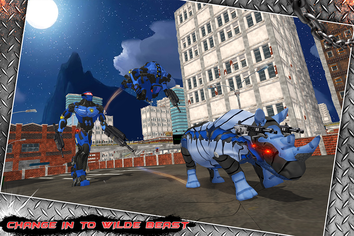 Ven y experimenta el futuro de la seguridad nacional. Siéntase seguro con el automóvil Rhino Robotic más avanzado que puede transformarse en un automóvil robótico, un rinoceronte robótico y puede ser una yegua nocturna para los malvados Robots y gánsteres que quieren diseminar el caos en la ciudad del vicio con Policías robóticos. Salta al Multi Police Rhino Robotic Car Vs Evil Robots.