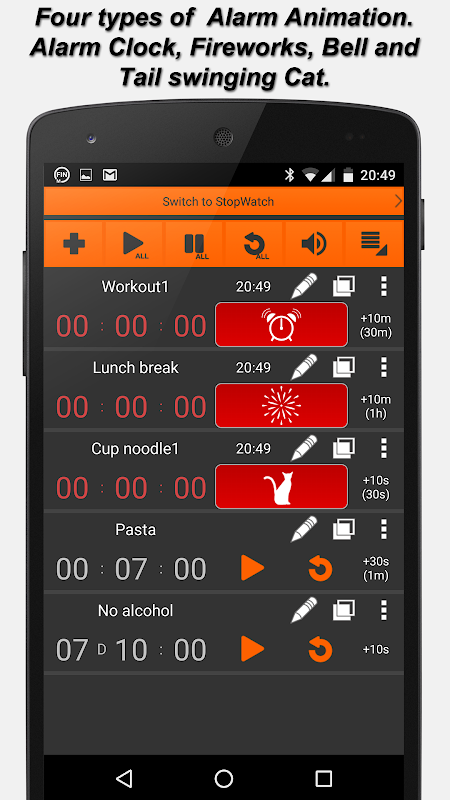 Cada temporizador puede tener un nombre, sonido de alarma, duración, etiqueta de color, vibración activada / desactivada y animación de alarma diferentes, incluida una animación de alarma de gato de cola linda.