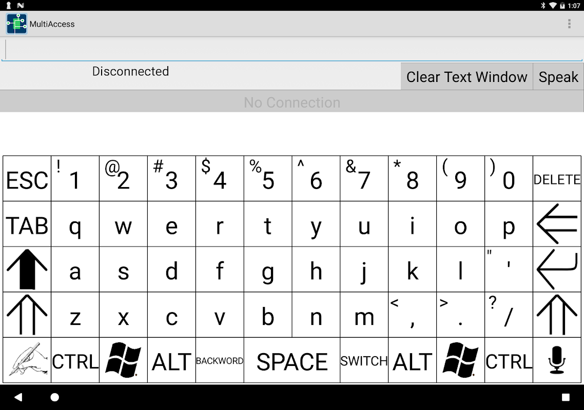 MultiAccess lets you seamlessly switch between the typing methods above (with some limitations) so that you can use the method that works best for the task at hand. MultiAccess is also a Bluetooth mouse. You can choose between a track-pad or joystick user interface.