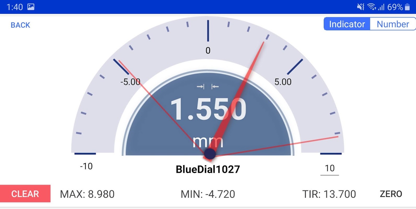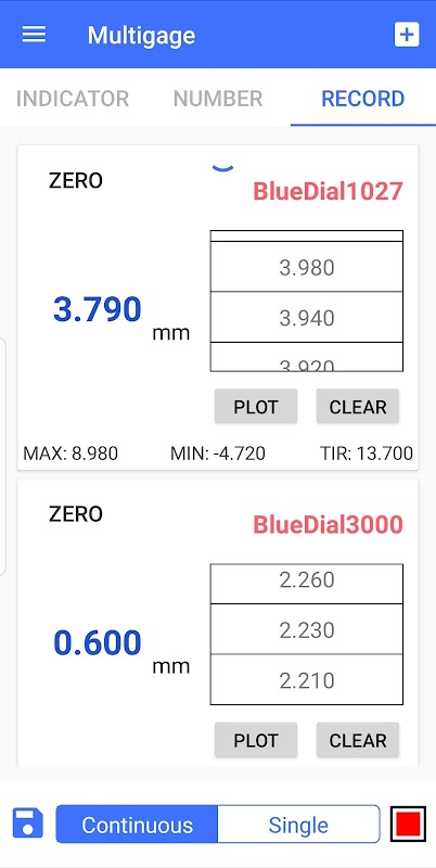 La aplicación MultiGage Reader es capaz de conectar hasta 8 unidades de dispositivos de medición Bluetooth Motionics y recibir lecturas de todos ellos al mismo tiempo. Cada dispositivo se asignará con un panel individual para mostrar la lectura de medición, max, min y TIR. El usuario puede desconectar un dispositivo o agregar más dispositivos sin interferencia en otros dispositivos y mediciones realizadas.