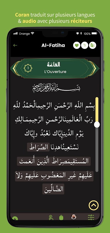 La aplicación cuenta con más de 3 idiomas de traducción del Corán y los Khassidas y una transcripción.