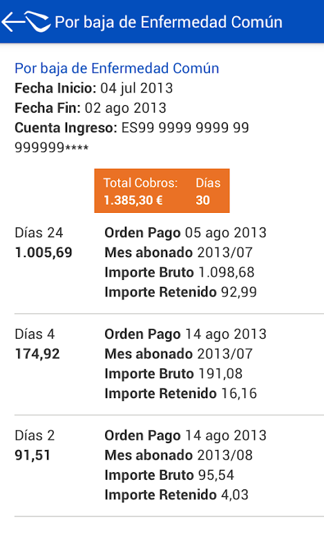 - Relación de los cobros recibidos, periodo, importe, días abonados y número de cuenta donde se ha realizado el abono.