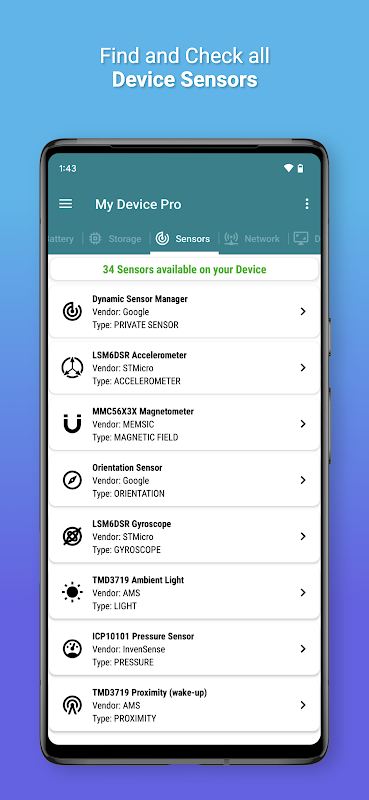 Esta es la versión Pro de "Mi dispositivo" sin ningún anuncio. My Device Pro es una aplicación potente y simple que te permite conocer todos los detalles esenciales de tu teléfono. Ya sea información sobre su Sistema en Chip (SoC), la memoria de su dispositivo o las especificaciones técnicas acerca de su batería o toda la información relevante sobre los sensores de su dispositivo: My Device pro es su lugar ideal para todo esto. Lista completa de todos los detalles de software y hardware.
