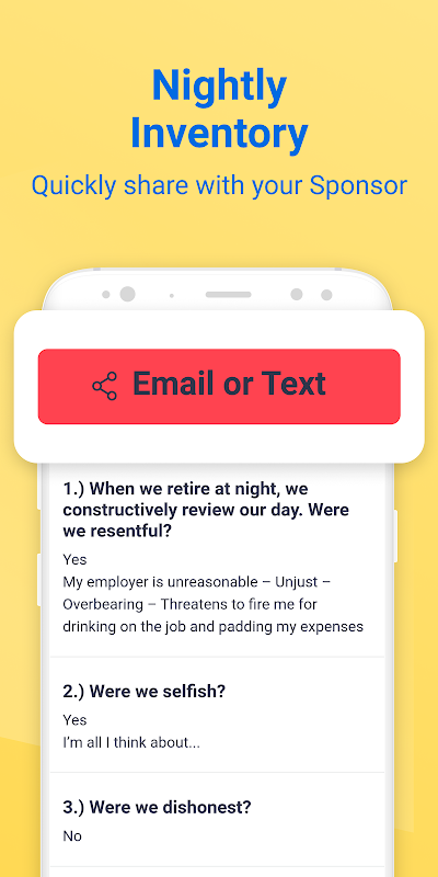 * Estamos tan enfermos como nuestros secretos y el programa de recuperación de alcohólicos anónimos se trata de compartir con otros, particularmente con nuestros patrocinadores. Así que My Spiritual Toolkit tiene una excelente función para compartir sus inventarios, diarios y listas de gratitud con su patrocinador o asesor de confianza. ¡Simplemente envíe un mensaje de texto o correo electrónico a su patrocinador directamente desde la aplicación y obtenga comentarios rápidamente!