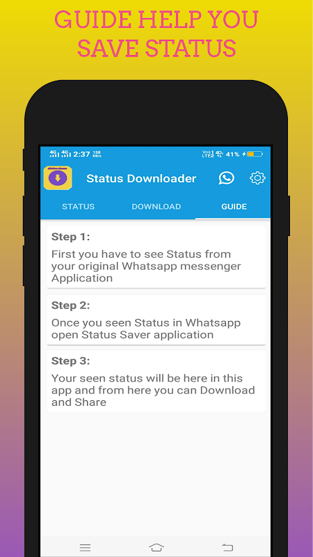 By using this application, we will be able to download these pictures and videos and save them into our device. This application will allow you to download video and image stories uploaded by your WApp contacts. You just have to install this Status Saver For WApp App to your device and it is simply ready to save and download anything from your WApp status and story.