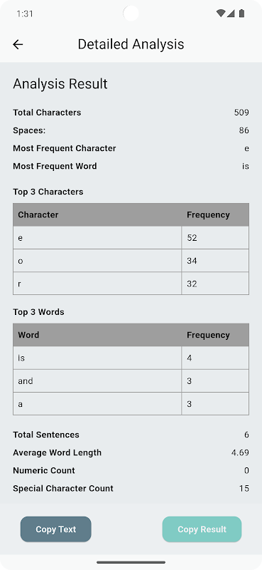 - Proporciona información detallada como el recuento total de caracteres, el recuento de espacios, los caracteres y palabras más frecuentes, las 3 frecuencias principales de palabras y la distribución de la longitud de las palabras.