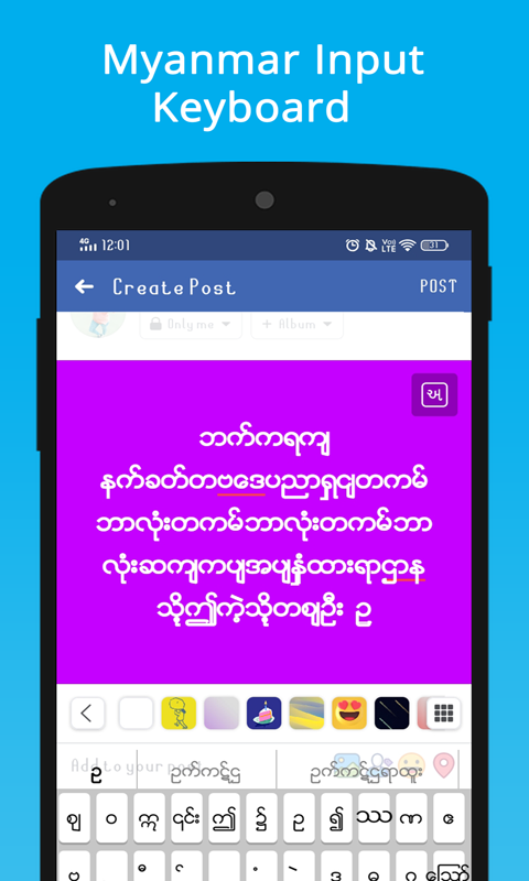 La aplicación de teclado de Myanmar le permitirá escribir mensajes, historias, publicaciones, blogs, correos electrónicos en Myanmar o el idioma del alfabeto de Myanmar en cualquier aplicación de redes sociales y aplicaciones de chat.