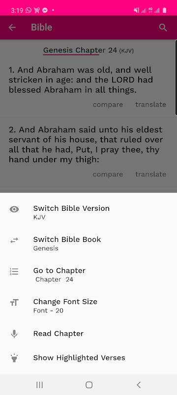 La aplicación viene con 7 versiones diferentes de la Biblia, a saber, versiones KJV, NKJV, AMPLIFIED, NLT, NIT, MESSAGE y NRSV.