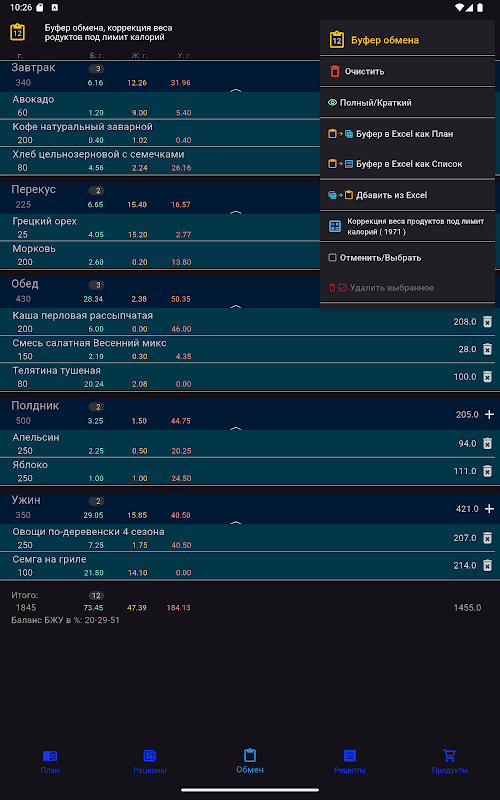 Planifica tus comidas según calorías y BJU, comparte tus comidas en Excel.