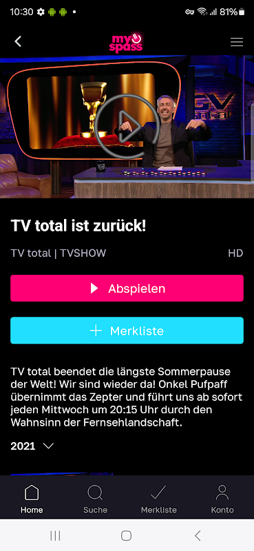 myspass te ofrece lo mejor de la comedia y el entretenimiento alemán, gratis y en una sola app. Ya sean clásicos o éxitos de las nuevas series, los amantes de la comedia encontrarán el valor de su inversión con nosotros, y es completamente gratis: nuestro contenido está disponible sin necesidad de suscripción ni registro. ¡Divertido, sin molestias!