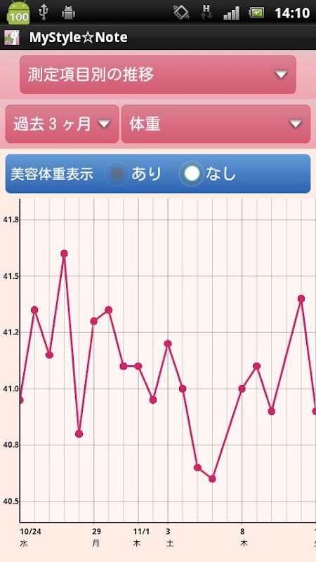◆好きな時に体重や体の各部位を測り、値をサイズ記録画面で登録し、データを蓄積することができます。