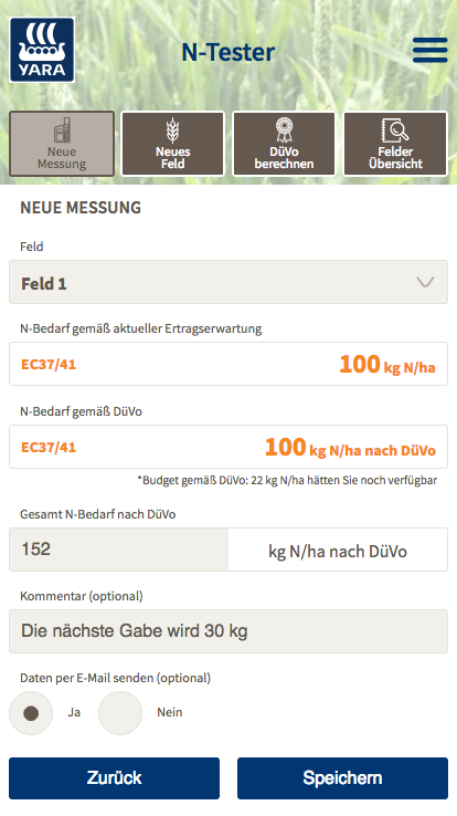 Die N-Tester App berechnet auf Basis einer N-Tester Messung Stickstoff-