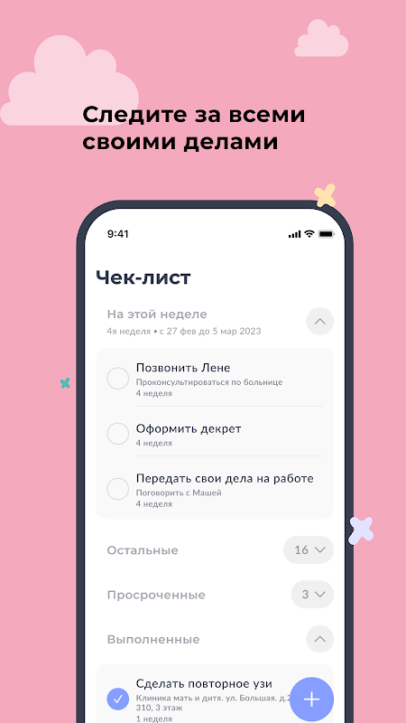 🔹 Embarazo y desarrollo del bebé Monitorea los cambios en tu cuerpo y el crecimiento de tu bebé por semana de embarazo, y después del nacimiento, haz seguimiento de etapas importantes de su desarrollo.