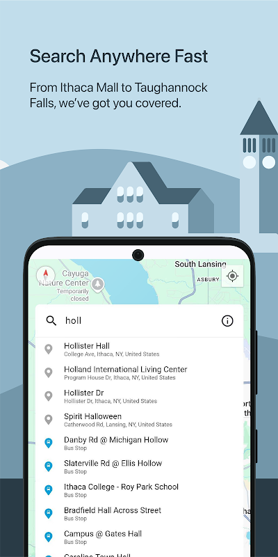 Ithaca Transit se integra con Google Places para permitirle buscar rutas de autobús a cualquier destino del país. Busque Chipotle o Waffle Frolic y deje que la aplicación se encargue del resto, ¡incluidas indicaciones precisas para caminar!