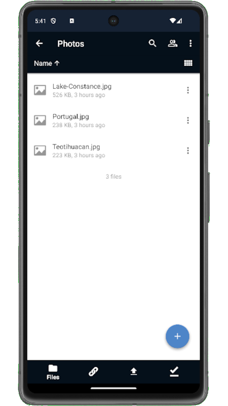 Con la aplicación NBN Cloud para Android, puede explorar todos sus archivos NBN Cloud sincronizados, crear y editar archivos nuevos, compartir esos archivos y carpetas con compañeros de trabajo y mantener el contenido de esas carpetas sincronizado en todos sus dispositivos. Simplemente copie un archivo a un directorio en su servidor y NBN Cloud hará el resto.
