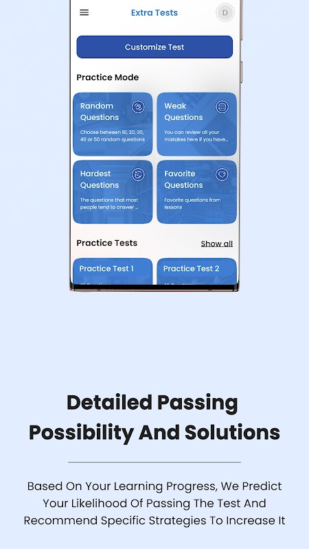 • Prueba simulada: La prueba simulada simula el formato de prueba real. Cuando termines el test podrás ver tu puntuación y repasar todas las preguntas.