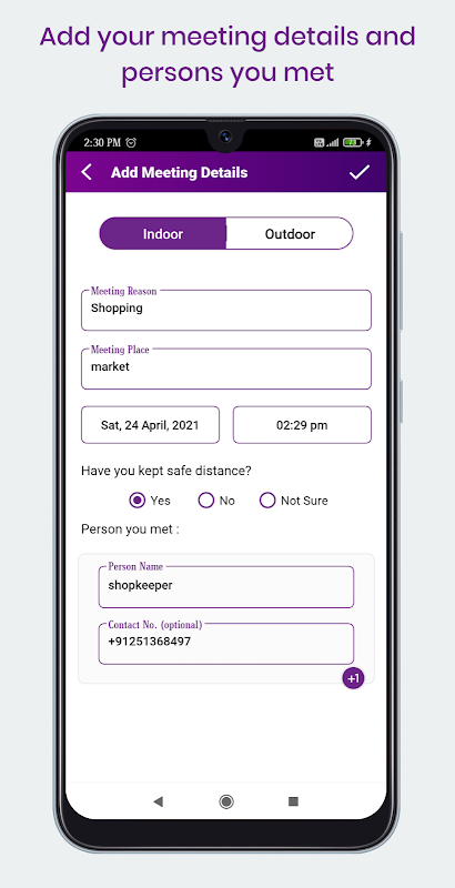 Every day you have to enter your meeting details I.e meeting reason, meeting place, persons you met in the meeting(their name and contact number) also date and time. In case of urgencies, you can access this details, and contact them easily. We also remind you daily( at 8p.m ) to enter your meetings details through out a day.