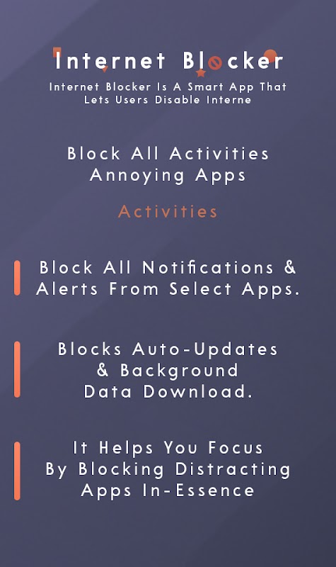 Con la aplicación Internet Blocker ahora puede bloquear ciertas aplicaciones para que no se conecten a Internet. Esto ayuda a los usuarios a reducir el uso de datos, evitar que una aplicación descargue datos en segundo plano, administrar el uso de la batería y mejorar la privacidad. Le permite bloquear completamente el acceso a Internet con un solo toque.