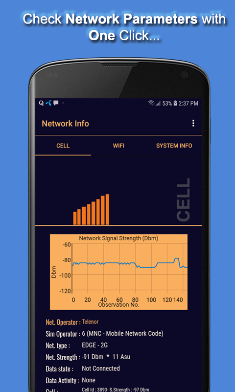 Network Signal Info es una herramienta de monitoreo de red. Con esta aplicación, puede medir el nivel de señal de la torre celular y los parámetros del operador de red, el nivel de señal de las celdas vecinas. También puede encontrar el nivel de intensidad de la señal de la celda vecina. La pestaña Wifi muestra toda la información relacionada con la conectividad Wifi, incluidos, entre otros, SSID, BSSID, velocidad Wifi, frecuencia y canal. La información del sistema de pestañas muestra información relacionada con el hardware del teléfono, incluido el fabricante, la marca, el IMEI, etc. También puede encontrar la velocidad de la CPU, el número de CPU, el ancho y alto de la pantalla y la información de la batería.