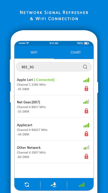 Network Signal Refresher & Wifi Connection wil show you all near your wifi connection and also show chart.You have also choice to search wifi button and search your network easily and refresh it.