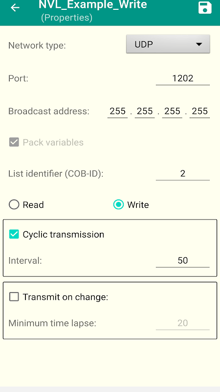 Las variables de red se definen por nombre en el proyecto CoDeSys y se intercambian automáticamente entre los PLC en tiempo de ejecución. Para ello, se resumen en las denominadas listas de variables de red. Puede haber varias listas por PLC. Dado que los datos se intercambian a través de mensajes de difusión, uno de los PLC actúa como emisor y los demás pueden recibir los datos. No son necesarias funciones específicas del PLC, pero las listas de variables deben ser absolutamente coherentes en todos los PLC. Para respaldar esta consistencia, el sistema de programación CoDeSys ofrece la opción de exportar una lista de variables durante el proceso de generación e importarla nuevamente al PLC receptor.