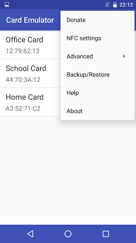 Un potente y gratuito simulador de tarjetas NFC que simula varios tipos de tarjetas: de acceso, ascensores/elevadores, identificación de personal (empresas y fábricas) o de alimentación. También simula parte de las tarjetas de alimentación escolar, de sistemas bibliotecarios y otras tarjetas IC.