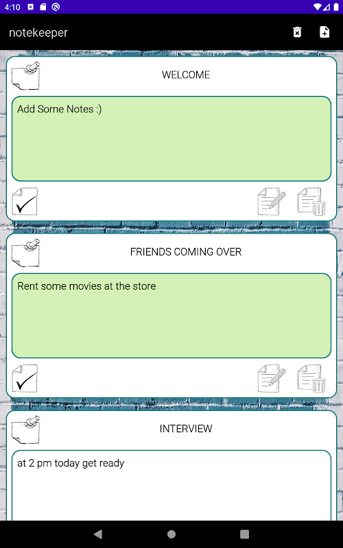 A small note keeping app that respects your free space and contains no ads written in kotlin , uses room for sql.